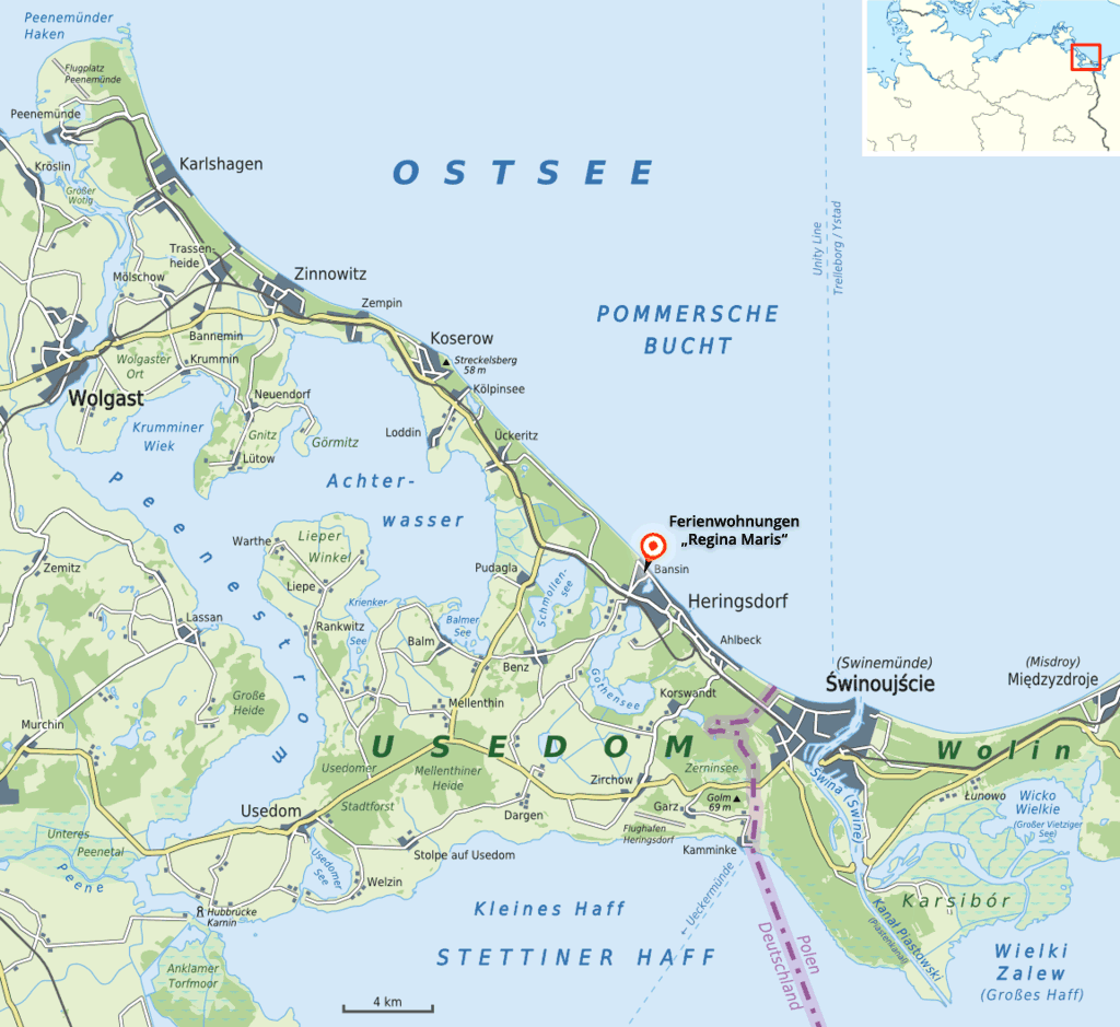 Das Seebad Bansin gehört zu den drei sogenannten Kaiserbädern der Insel Usedom. Der Ort wurde 1897 speziell zum Zweck des Badebetriebes gegründet. Hier befindet sich in direkter Stadtnähe (Entfernung ca. 80m) die neuerbaute Ferienanlage "Regina Maris", in der sich unsere beiden Ferienwohnungen befinden. Vom Haus sind es nur wenige Schritte bis zum Ostseestrand, zur Seebrücke, zur Konzertmuschel oder zum Haus des Gastes. Unmittelbar hinter dem Haus liegt ein großer Buchenpark, in dem für die Kinder auch ein Spielplatz angelegt ist.